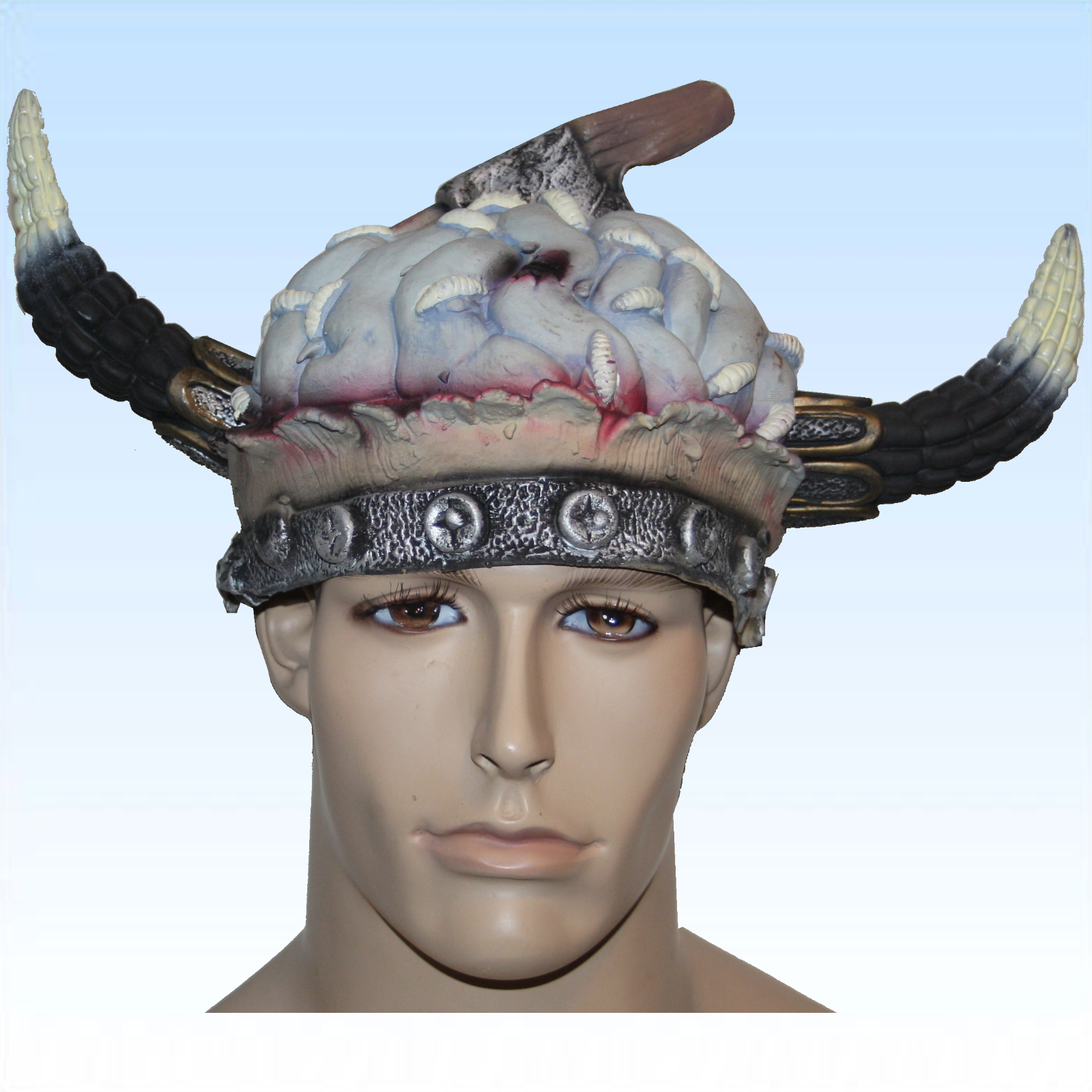 Bei diesem Horrorhelm sieht man das von Würmern zerfressene Gehirn, in dem eine Axt steckt.
