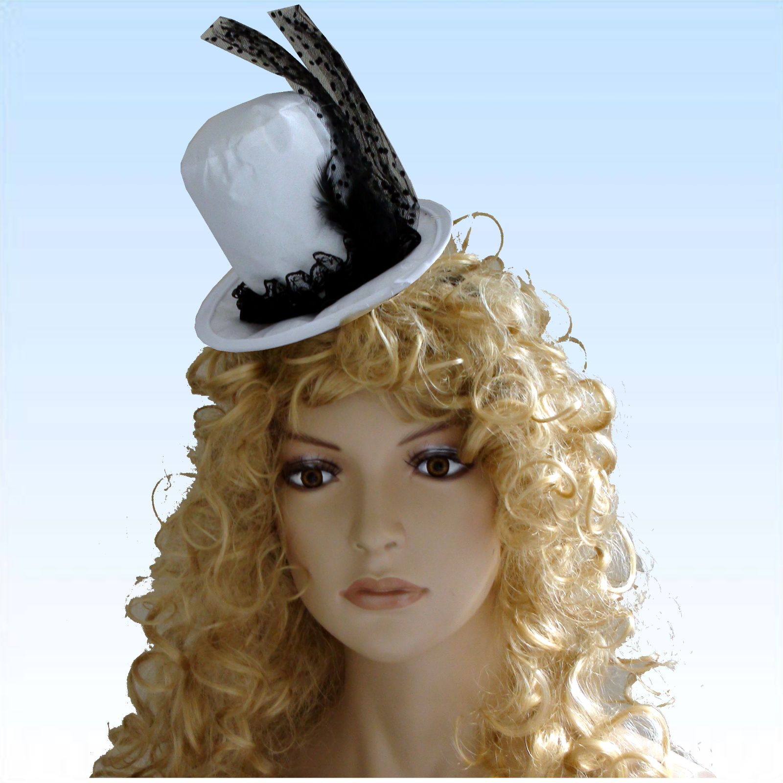 Eleganter weißer Minihut mit schwarzen Accessoires und Haarreif für sicheren Halt.