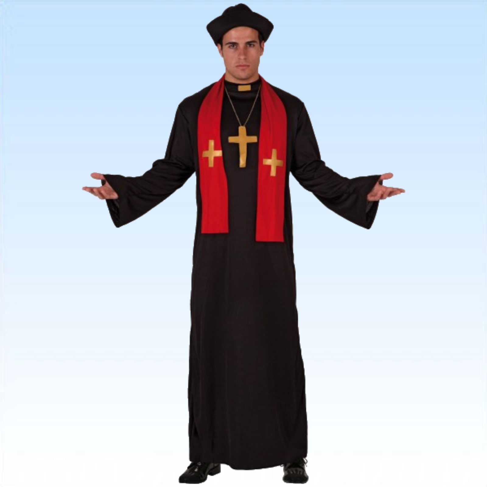 Priesterkostüm bestehend aus Priesterkutte, roter Stola, Hut und goldenem Stoffkreuz mit Kette.