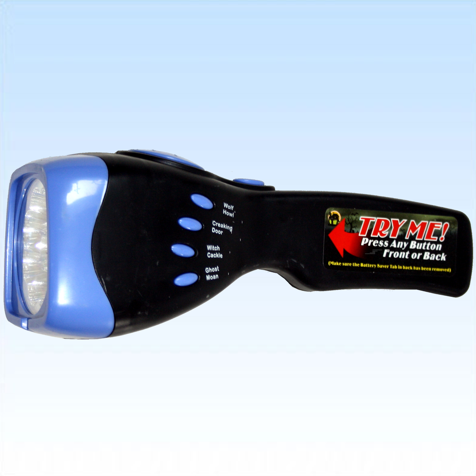Beim Druck auf eine der 8 Tasten der Taschenlampe ertönen verschiedene Horrorgeräusche, beim Druck auf die obere Taste blinkt, bzw. leuchtet die Taschenlampe normal.